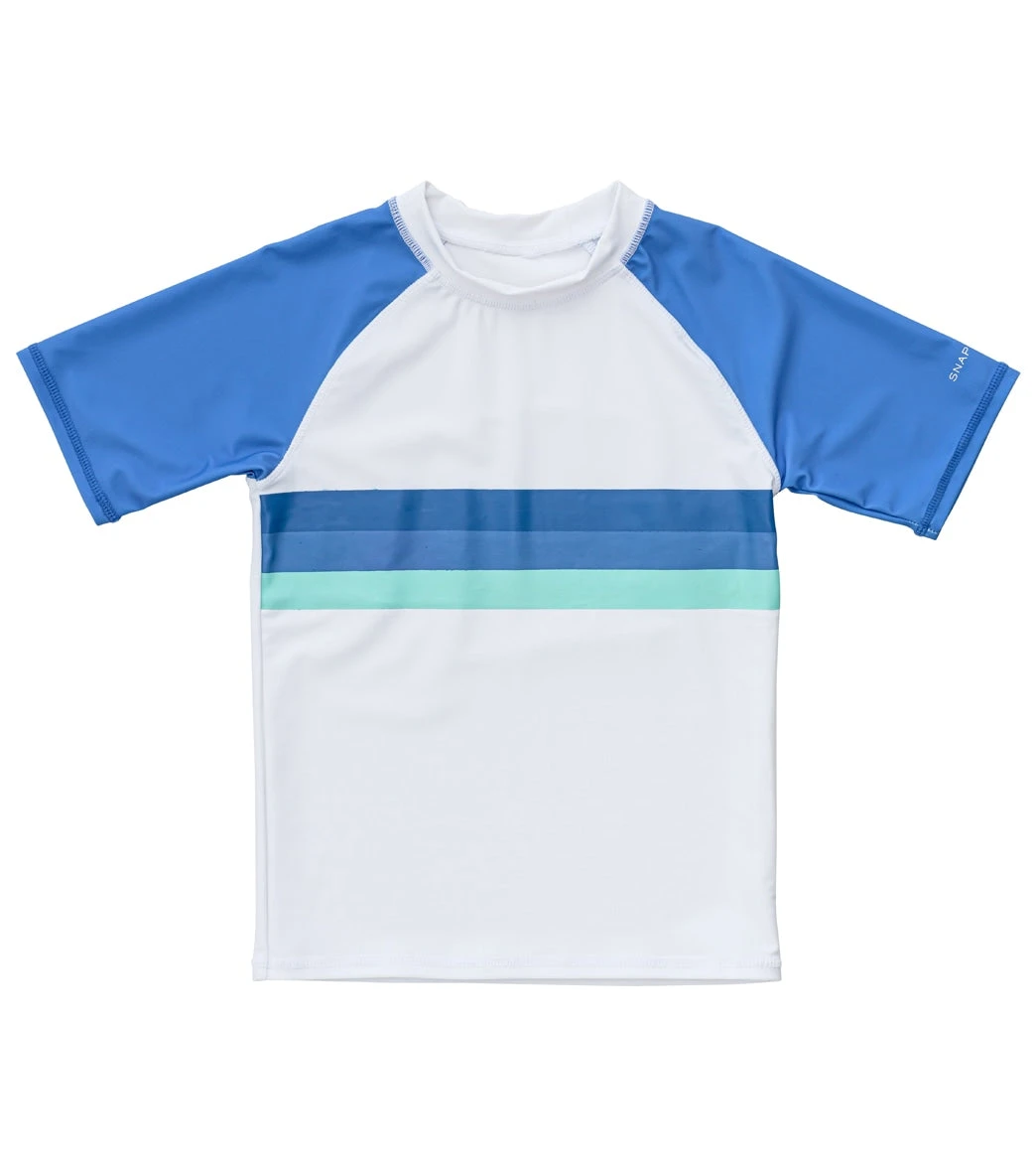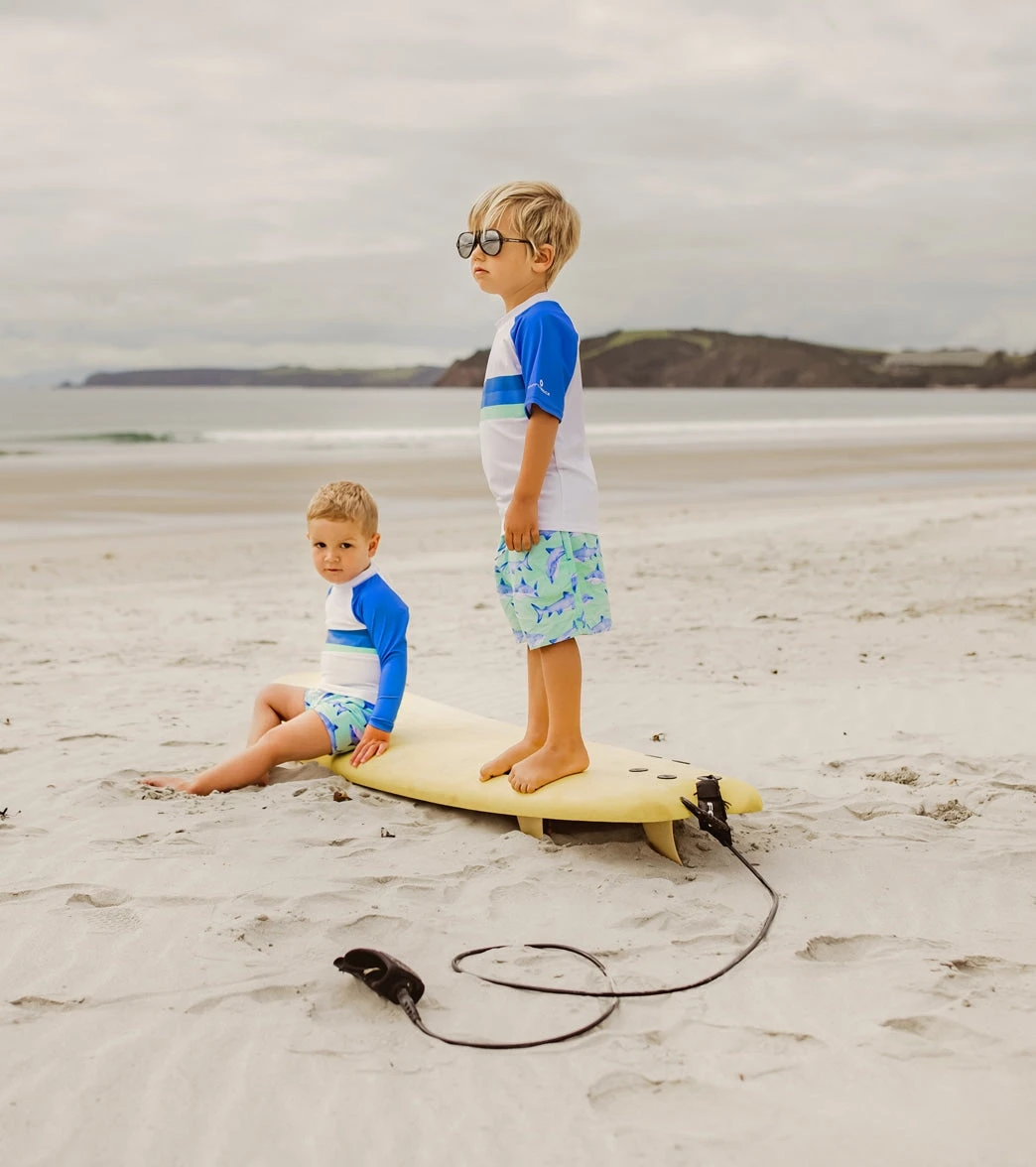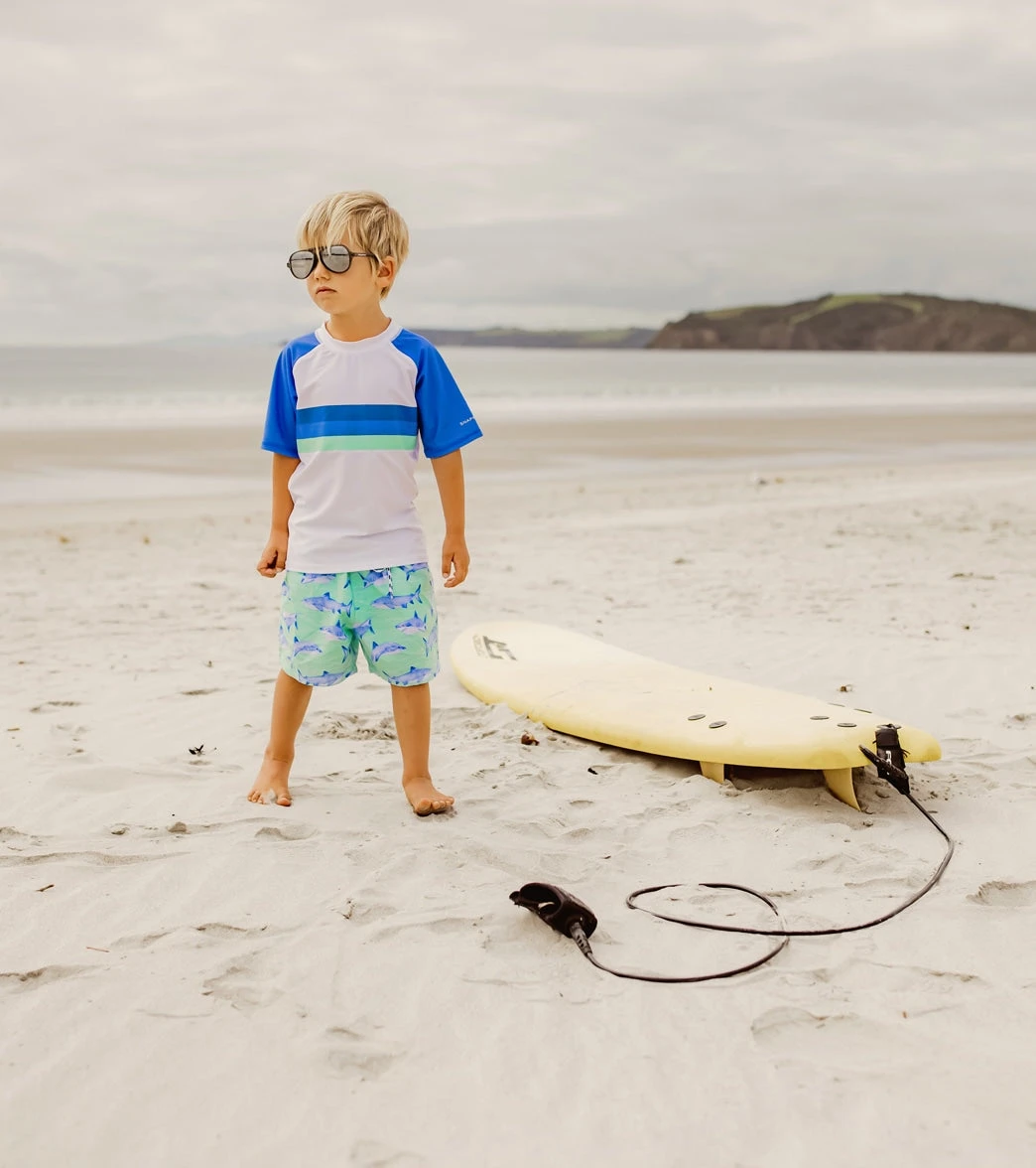 Hit the wavesin The Shark Stripe Rash Top. Featuring a retro stripe print in shades of mint and mid blues with solid blue sleeves in The UPF 50+ Sun Protection fabric.