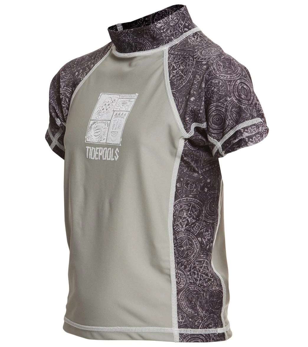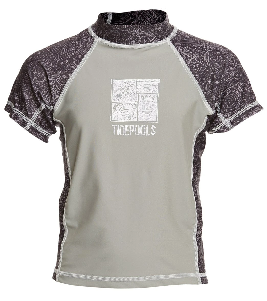A rash guard serves as the perfect extra layer against scrapes and sunburn. The Tidepools Boys Sundial UV 50+ Short Sleeve Rashguard provides reliable coverage that blocks nearly 99% of harmful UV rays. Plus, the fun print on the sleeves and neck adds a summer-ready look.