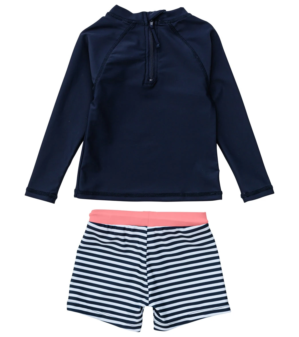 Surfs Up in The Sunset Cruising Long Sleeve Baby Set. Featuring a protective long sleeve rash top in Navy, with signature Surf print, and matching swim shorts in Navy/White stripe. Made using The UPF 50+ Sun Protection fabric, to help protect the little ones skin from the harmful suns rays.