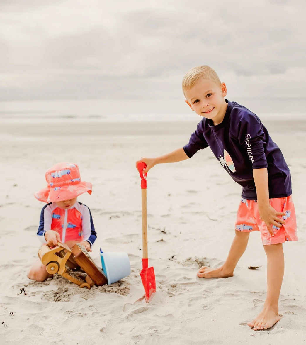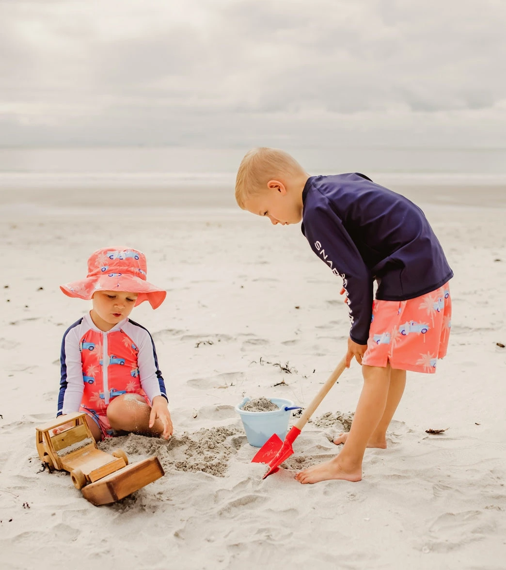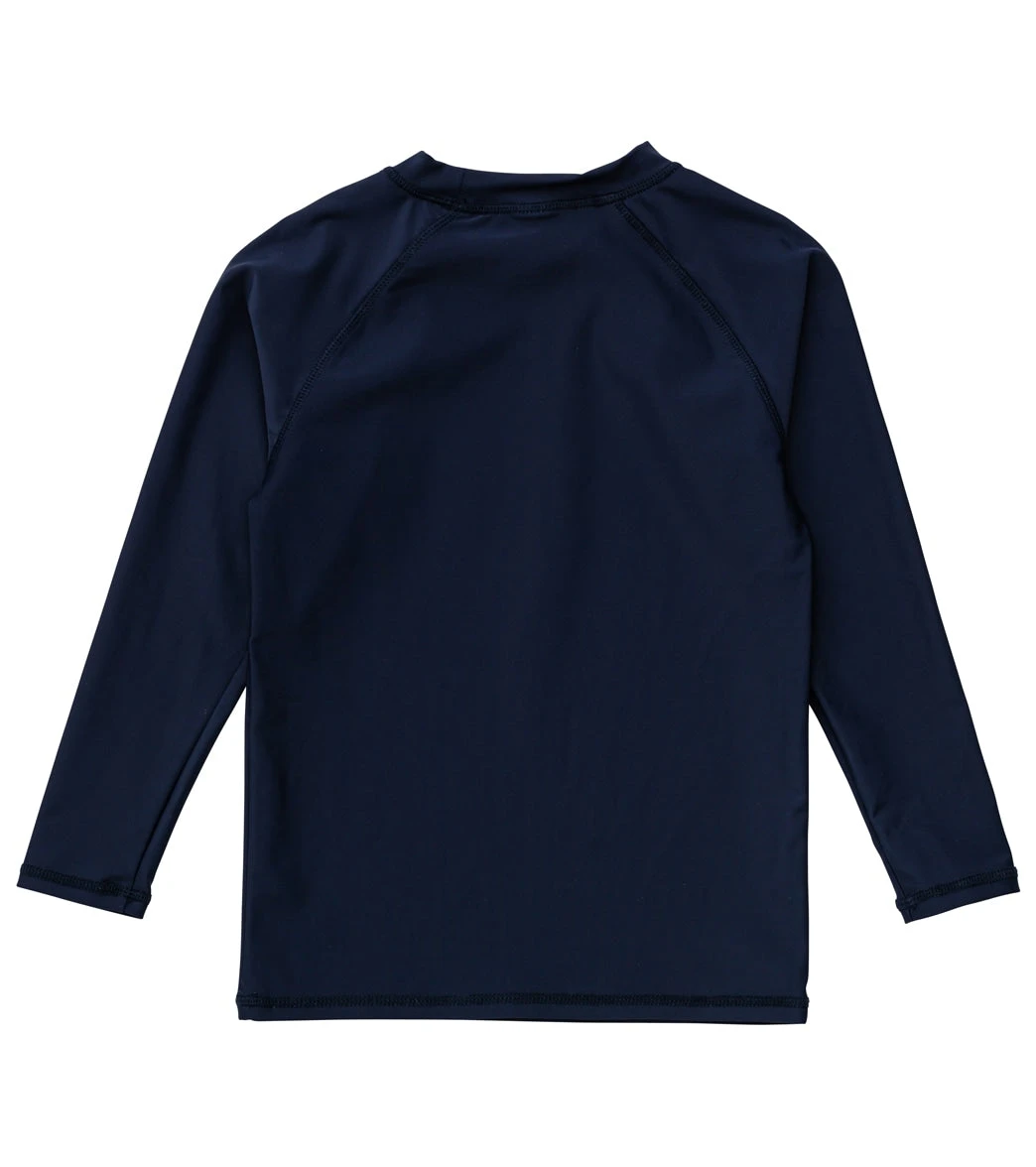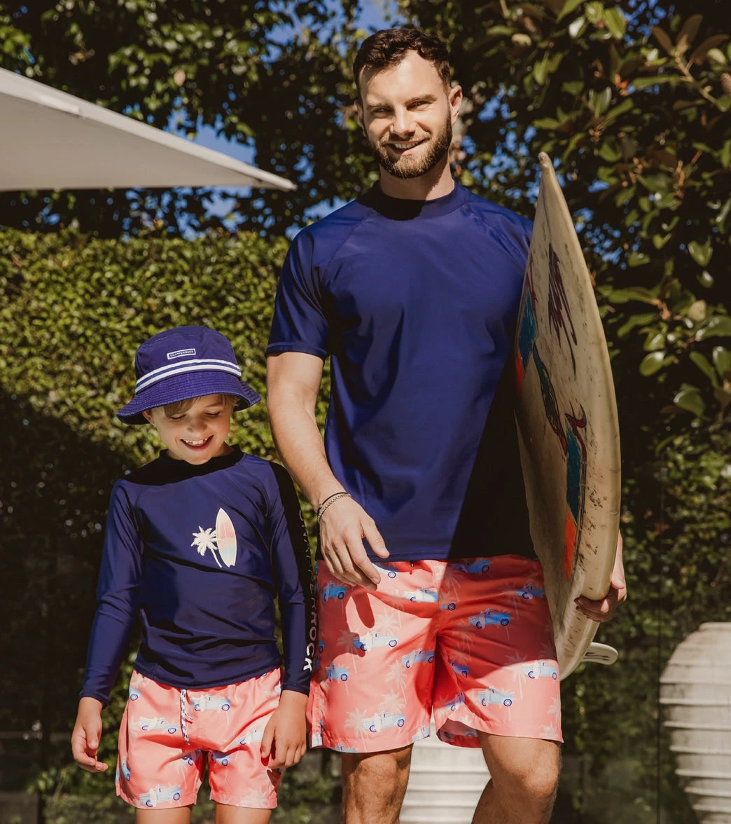 Everybody go surfing in The new Sunset Cruising Navy Rash Top. In a deep navy shade with The signature print featuring Palm Trees and Surf Board. Made in The UPF 50+ Sun Protection fabric, your skin will be protected while out catching the waves.