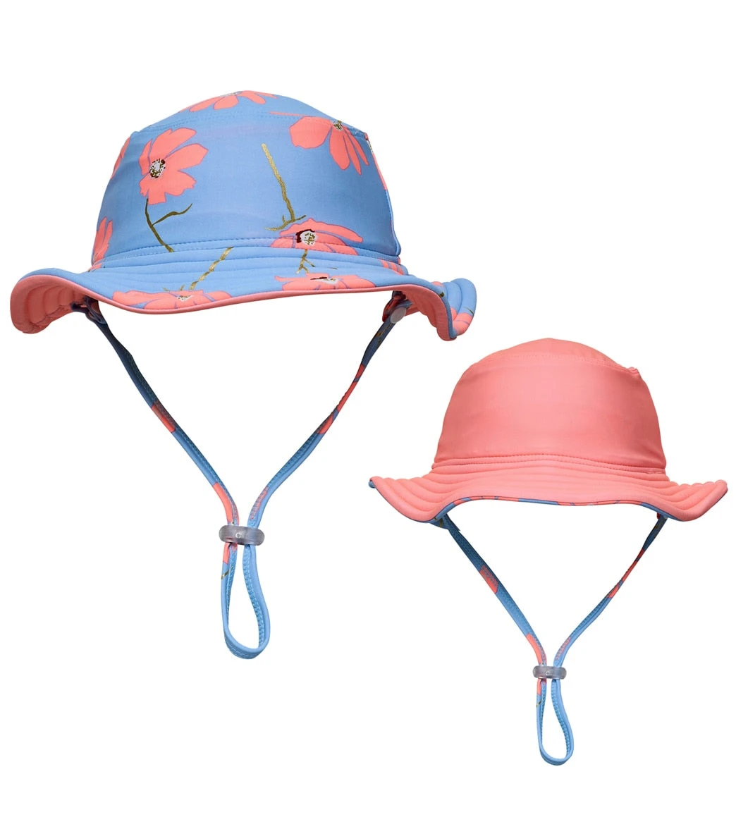 Splash and play all afternoon in the Snapper Rock Girls’ Beach Bloom Reversible Bucket Hat. Featuring a peach flower print with gold stems on a cornflower blue background on one side and peach on the reverse side.