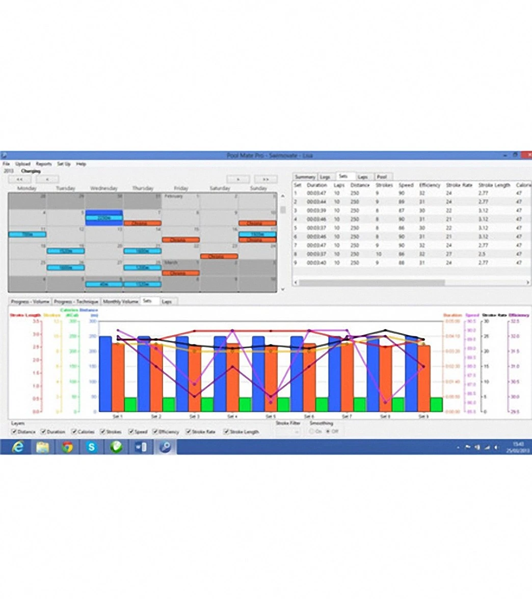 - Tracks laps, strokes, speed, distance, calories, stroke length, stroke per minute, duration, and efficiency.