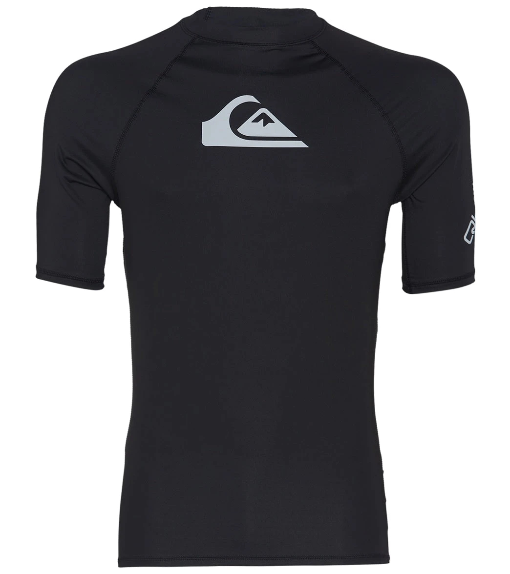 The Quiksilver Men’s All Time Short Sleeve UPF 50 Rash Guard features strong and stretchy surf fabric that’s chlorine resistant and reinforced with SWR-shielding made from recycled yarn.