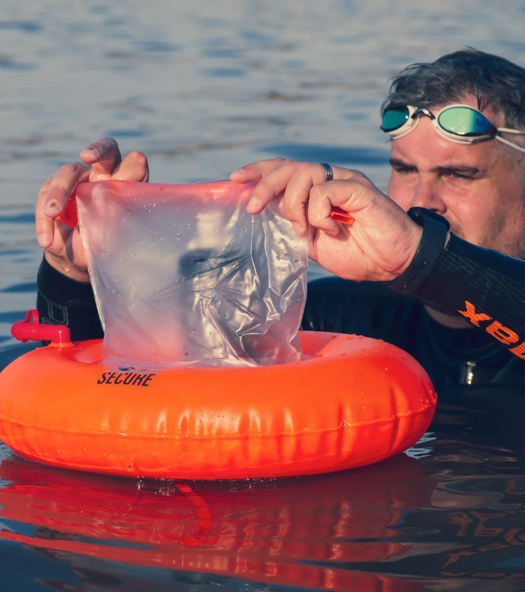 The Tow Donut is a highly visible tow float swim buoy with waist strap and an integrated dry bag pouch. The small dry bag sits in the centre of the donut, out of the water, and is perfect for small items such as car keys and phone. The pouch can be opened on the water allowing you to access your drink, gels or medication.