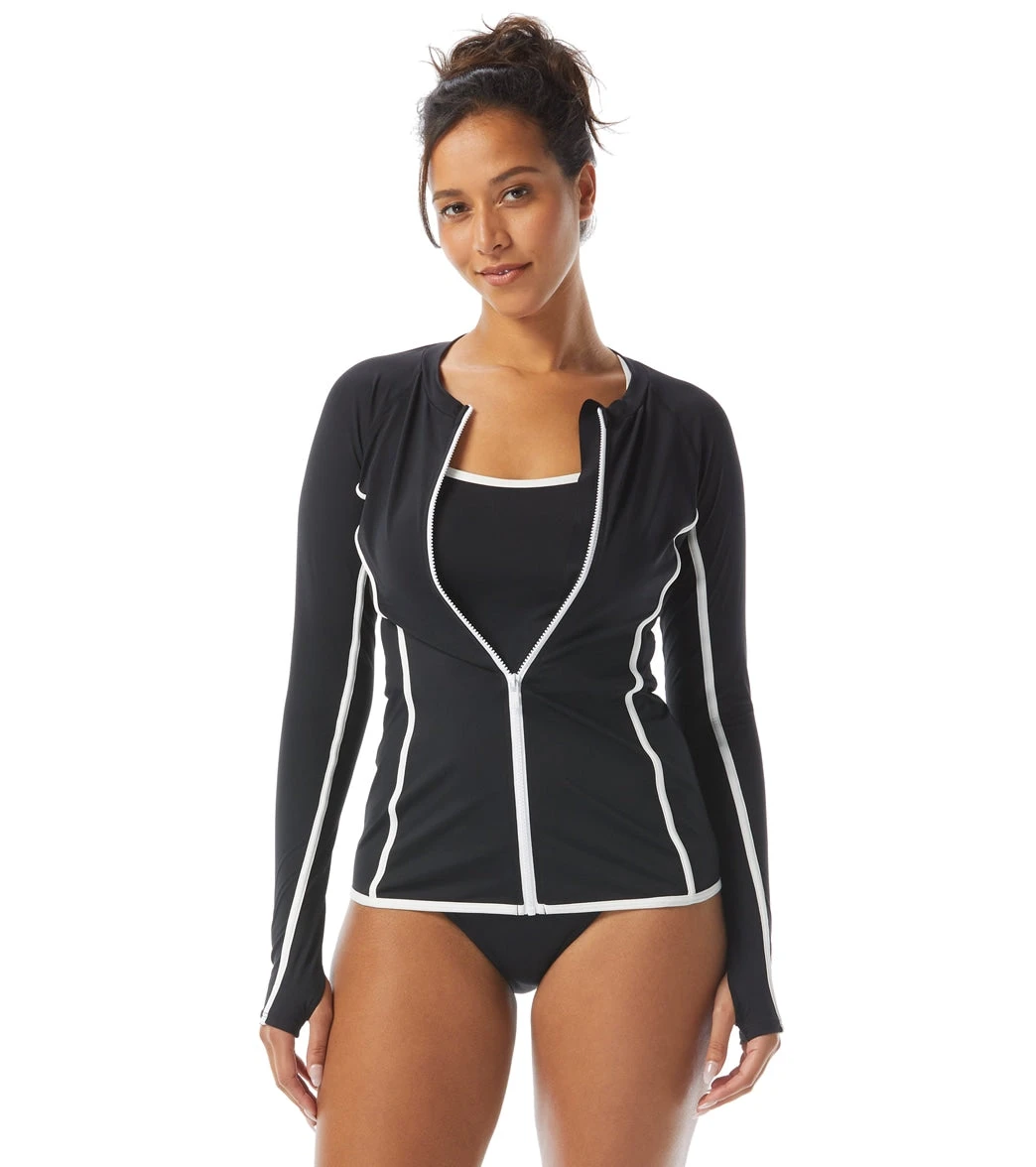 The Beach House Women’s Piping Solid Ava Zip Front Rash Guard is designed with high-end fabrics that bend with you for extra comfort, an easy fit, and strong shape retention.